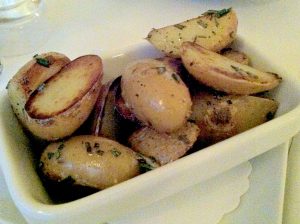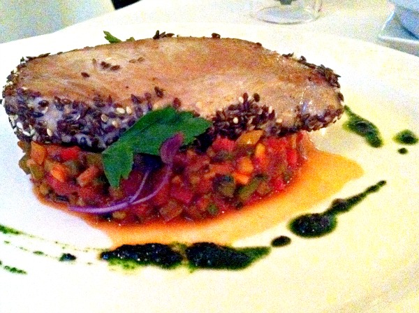 A pak ještě steak z tuňáka se zeleninovou ratatouille a rozmarýnovými brambory 600 Kč. Nedokážu si ratatouille představit nezeleninovou, to zaprvé. Zadruhé však, a to je mnohem podstatnější, člověk čeká od tohohle pokrmu to, že bude splňovat hlavní podmínky. To, že někam smíchám papriku, cuketu , cibuli a rajčata a přihodím česnek, ještě ze směsi ratatouille neudělá. Zelenina byla totálně křupavá. Snad každý šéfkuchař by měl tušit, že se jedná o dušený pokrm, který žádá svůj čas společně pod pokličkou a tohle se mu nepodobalo ani při pohledu z jedoucího vlaku. Tuňák byl ok, co do čerstvosti, můj žaludek na to má jasný indikátor, kdyby ne :-D… Měl být medium. Někde byl rare. Někde medium well. Prapodivně propečeno, také trochu nerovnoměrně uříznuto. Velkou módou poslední doby jsou brambory dělané akorát aby byly skoro na skus a ani o chlup víc. Pro moje chutě jsou v té chvíli ale nedovařené a nepřicházím trendu na chuť. Takže tenhle pokrm byl pro mě velkým zklamáním.