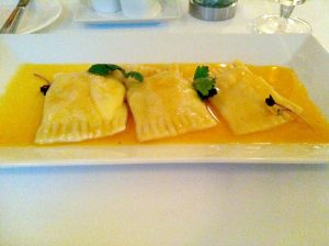 O amuse-bouche tu bohužel neslyšeli, místo toho dostanete bylinkové máslo s pečivem. Nepřítomnost pozornosti na začátek považuji v téhle cenové kategorii už za nedostatek, pardon. No a konečně k jídlu. Domácí ravioly plněné mušlemi Sv. Jakuba a ricottou s pomerančovo-šafránovou omáčkou 290 Kč. Nějak mi tu nesedí čísla. Ravioly byly tři, to ano, ale mušle jen jedna. Slovo „mušlemi“ chápu jako navádění hosta v oblasti množství zásadní ingredience. Jednu mušli totiž horizontálně dvakrát rozkrojili, a tak vznikly tři tenké plátky a každý z nich zamířil do jedné ravioly. Těsto tuhé, tlusté, připomínající spíš to na povidlové taštičky než italské ravioly. V omáčce nic než pomeranč cítit nebylo. Bohužel to vlastně platí pro celé jídlo. Ravioly neochucené a syrová jakubka v tom to bohužel nezachránila, sama nemá výraznou chuť.