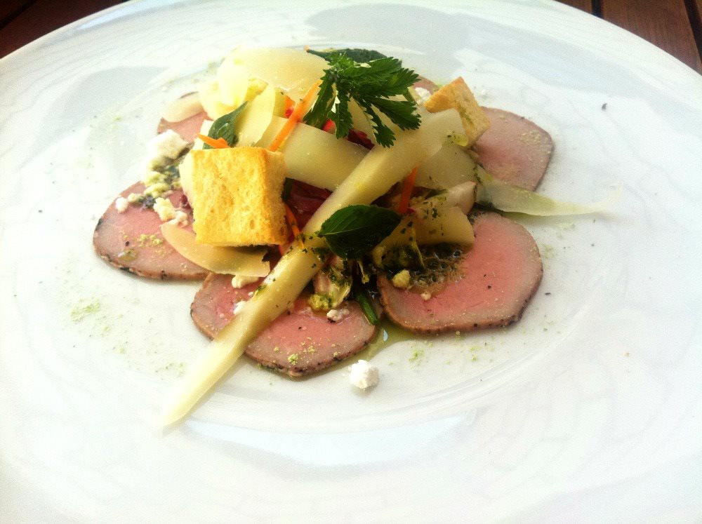 Carpaccio z pomalu pečené telecí špičky s parmazánem, listovým salátem s pestem a prachem z ovocného oleje 165,-. Maso uvnitř ještě lehce dorůžova, měkké, voňavé. Příjemný předkrm, který splňuje svou hlavní funkci – navnadit. A to „téměř” dokonalé proto, že ne každému bude vyhovovat hořká chuť čekanky radiccia v salátu, který bych si dokázala představit trochu více ochucený tím pestem… a prach se mi asi někam odprášil… fakt jsem ho tam nikde nezaznamenala :)