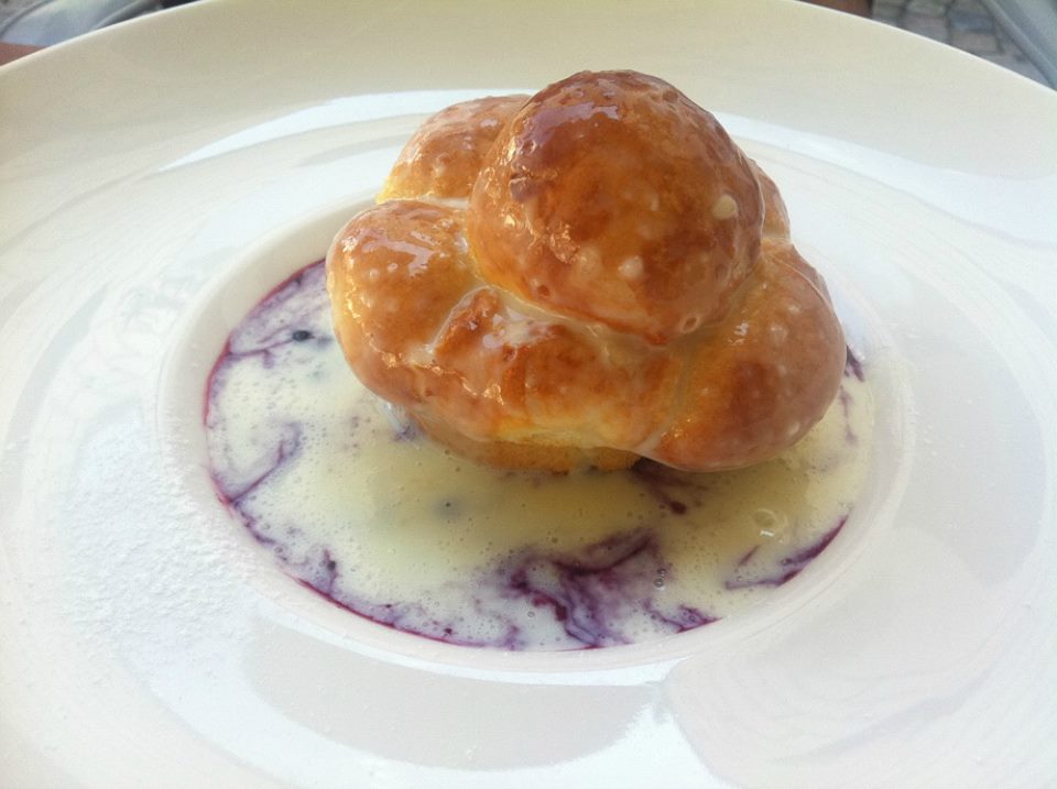 Dukátové buchtičky s borůvkovým žahourem a šodó 95,-. Chod, který v mnoha restauracích nedostává na jídelních lístcích prostor, a přitom tyhle buchtičky má rád snad každý. Mně ve školce chutnaly tolik, že jsem si první oficiální porci (ano, i se šodó) nacpala do kapsiček od zástěrky a šla si přidat… v zástěrce měly zůstat „na potom” (myšleno na období po obědovém povinném spinkání). No, udělala jsem to jen jednou, to asi chápete. Baví mě ta muffinová bábovička z nich vytvořená. Nejdřív dostanete na stůl jen talíř se žahourem a bábovinou a číšník hned zalije šodó. Byl tak rychlý, že jsem nestihla blýsknout mezifázi. Nové pojetí, tradiční chutě. A „téměř”? No, možná mi nemuseli polívat shora ty buchtičky a nalít šodó jen do žahouru… jinak fakt nevím.