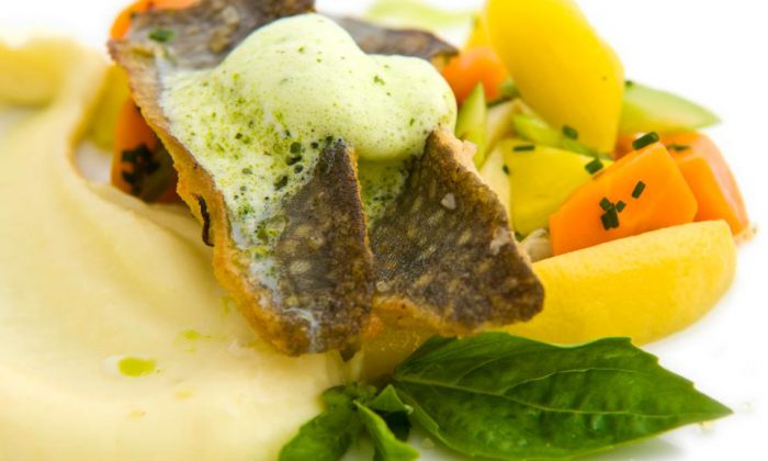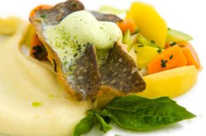 s jemným bramborovým pyré, máslovou zeleninou a pěnou z rukolového pesta