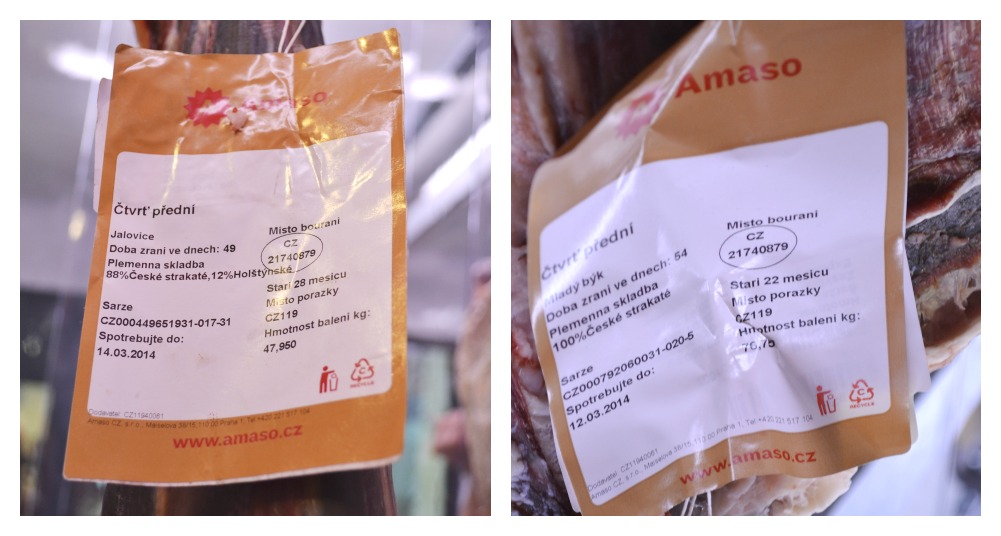 Amaso má, podle informací, které tu padly, své „kontrolory“, tedy lidi, kteří za všemi farmáři a chovateli jezdí a nabádají je ke správnému chovu, krmení i porážce. Využívají maso nejen z mladých býků, ale také jalovic (kravka, která ještě neměla telátko) a volků (mladý bejcí, kterým ušmikli kulky). Poslední dva případy po staření totiž mnohdy vykazují lepší chuťové vlastnosti masa, než-li mladí býci. Je to kvůli soustředění tuku v těle, jež vytváří kýžené mramorování. Zajímavé jsou i názvy označující maso v pultu. Květová špička nebo vrchní šál, to vám přeci jen asi něco řekne – ale co třeba bryndáček nebo holubička? He? Vše tu nazývají původními jmény řezů, jež se u nás používala už za dob pradědů. Vždycky na ten název přišli podle toho, co jim tvar masa připomínal. Navíc tu najdete i pověstnou oponku. Tu jsem si dala v ČESTRu a je fakt, že není vůbec žádná legrace ji někde vůbec sehnat (jedná se o vnitřní sval který odděluje bránici a břicho – nebo tak nějak velmi podobně řečeno). Všichni prodávající tu ale ovládají i zajeté hanger, flank i flap steaky, takže vám ty bryndáčky přeloží. Bryndáček je flap, kupříkladu. Zaujal mě i místní hamburger. Není nijak ochucený, jen maso – Koko hlava děravá – pamatuju si, že je z předního : 60% krku a 40% … eee … hrudí. Myslím… Naopak ze zadního se tu mele tatarák. Na prodejně nebude vždy ten samý sortiment. Jestliže sháníte něco naprosto konkrétního, je fajn si raději zavolat předem. Nebo si dané maso objednat přes e-shop. Očekávaná je i sezonní nabídka v podobně mladých mas na jaře či zvěřiny na podzim.