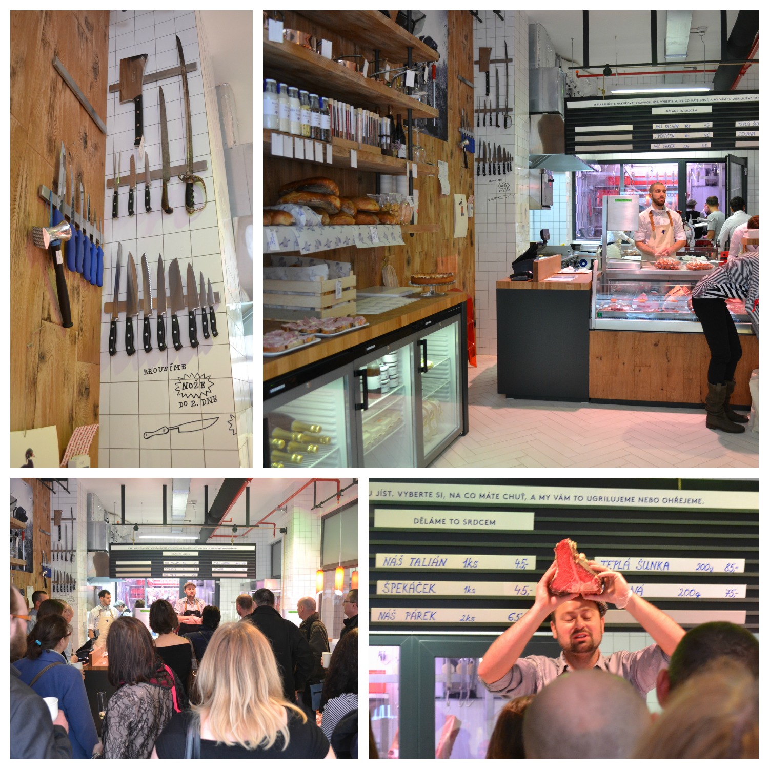 Prodejna není nijak velká. Dominují přírodní materiály. Výloha přímo do Dlouhé ulice, u okna se tísní tři stolečky pro dva (to je to bistro), pár metrů pro případné fronty zákazníků, pult s nabídkou, za pultem už jedna zpracovávací plocha, kde se mele, chladí, peče, smaží, brousí, krájí. Potom skleněná příčka a za ní zima zimoucí. Kolem 2 °C. I tam celou šichtu pracují řezníci a porcují maso. Můžete to tam sledovat v přímém přenosu. Za nimi, oddělená průhlednými plastovými plástvemi, se nachází nejdůležitější zrací resp. stařící část řeznictví. Tam to prostě visí a visí a čeká se. Dny. Týdny. I měsíce.