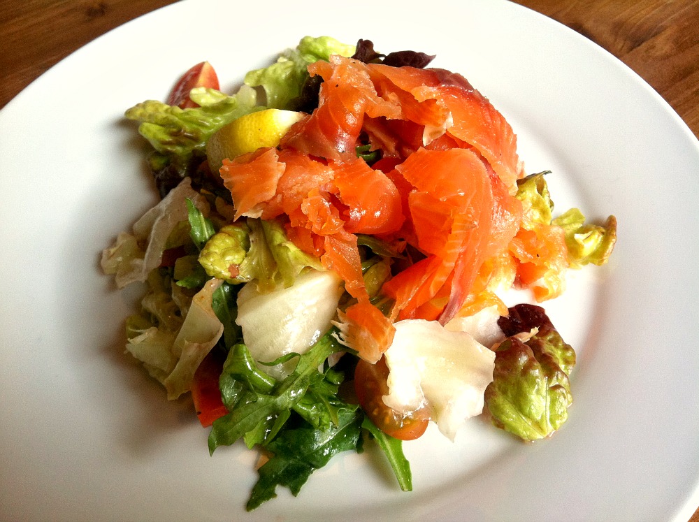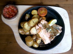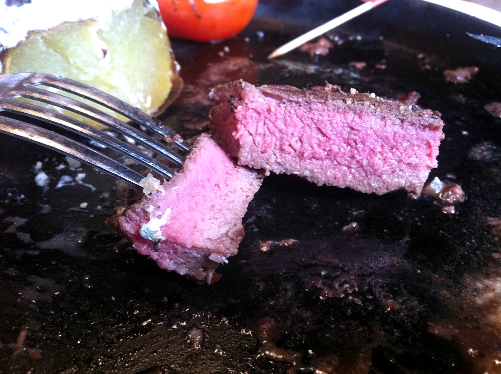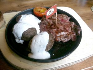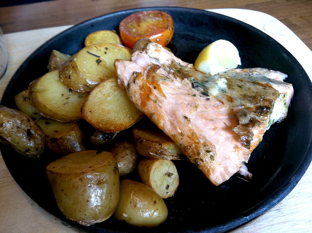 A teď jde do tuhého. Nechci se v tom moc nimrat, toho jsem si užila dost nad talířem v restauraci. Takže Steak z čerstvého lososa 200g s rozmarýnovými brambůrky a omáčkou Criolla ze sekané zeleniny, čerstvých bylinek a olivového oleje, celkem za 260 Kč. Chjo, pokud jsem ve steakhousu a jako specialitu z grilu nabízí i lososa, tak alespoň předpokládám, že bude opečený, to nebyl ani z jedné strany – byl dušený, neochucený, navíc ocasní část (!!!), kterou si mají nechat na tatarák nebo marinování, nicméně ne na gril, bez kůže a velmi nevzhledně s ponechanou tmavou tukovou vrstvou… dušená ryba špatně udělaná, zbytečná smrt. Ale pokud byste tam chtěli jít na tu omáčku a brambory, tak ty doporučit můžu.
