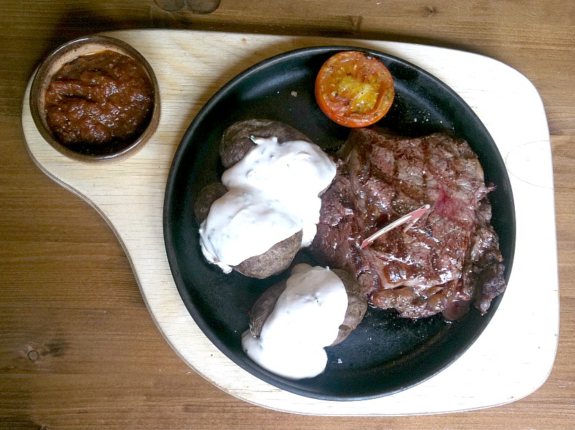 Bohužel má doporučení se vyhýbají i Bio entrecotu 200 g s pečenými brambory ve slupce s pažitkovým dipem a salsou chipotle z rajčat a uzených papriček jalapeňos, celkem 300 Kč. Nerada bych křivdila, ale vždycky bude něco špatně. Bohužel, maso mi připadalo mražené. Hned po přinesení v horkém stavu z grilu to tak znát není, ale jak postupně chladne, struktura masa je jiná, než když si koupíte uleželé hovězí, uděláte ho na grilu na zahradě a ono pak vychladne – je pak žvýkavé, ale stále šťavnaté. Tohle byl suchánek. A na to, že jsem si ho dala medium rare, tím spíš. Nedojedla jsem ho. Pokud mražené nebylo, bylo buď celkově nekvalitní a nebo s ním kuchař nezachází, jak by měl. Jak říkám, každá možnost je ale špatně. Brambory měly tvrdou a nepoživatelnou slupku, že jsem jen dlabala vnitřek a omáčka měla pálit… nepálila. A ta rajčata tam nestojí za zmínku.