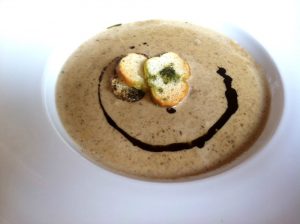 Jídelní lístek na první pohled ale nevypadal vůbec špatně. Začínala mi dokonce svítat naděje. Na krátko. Ještě celkem ucházející byl Jemný krém z lesních hříbků s bylinkovým chipsem a kapkou dýňového oleje 62 Kč. O balzamiku, které bych si tu s klidem odpustila, v menu nebylo ani slovo, ale polévka krémová, se smetanou to nepřeháněli a hříbková vůně se linula kolem stolu. O něco hůř bylo u Marinovaného lososa v limetkových listech s koňakem na trhaném salátku s grepem 87 Kč. Znělo to lépe, než chutnalo. Po limetkových listech a koňaku nebylo v chuti ani stopy, losos sám o sobě nedochucený. A marinovaný tam ležel už celkem delší dobu, asi to není položka, která by z jídelního lístku byla nejobjednávanější, usuzuji z lehké oschlosti plátků. Jako pečivo k předkrmu byl rohlík zkoseně vejpůl rozkrojený.