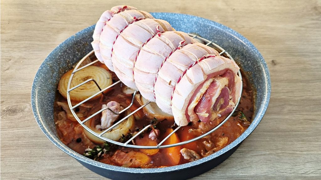 Do hrnce přidáme nakrájenou kořenovou zeleninu a restujeme ji do hněda. Vrátíme zpět orestované kosti, přidáme celé stroužky česneku, bobkové listy, rajčatový protlak a celý kmín. Krátce zarestujeme, aby se rozvinuly chutě. Přidáme hrst kysaného zelí pro charakteristickou chuť segedínské omáčky. Zalijeme ředěným kuřecím vývarem (celkem 1,5 litru tekutiny) a přivedeme k varu. Na hrnec s omáčkovým základem položíme mřížku s porchettou a špekem. Pokud máme vpichový teploměr, umístíme ho do středu masa, abychom mohli sledovat vnitřní teplotu.