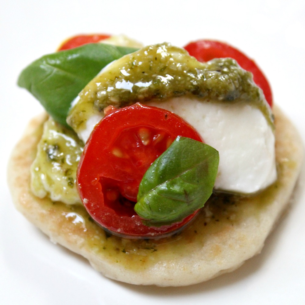 Bliny, cherry rajčata, mini mozzarella, pesto, bazalka.