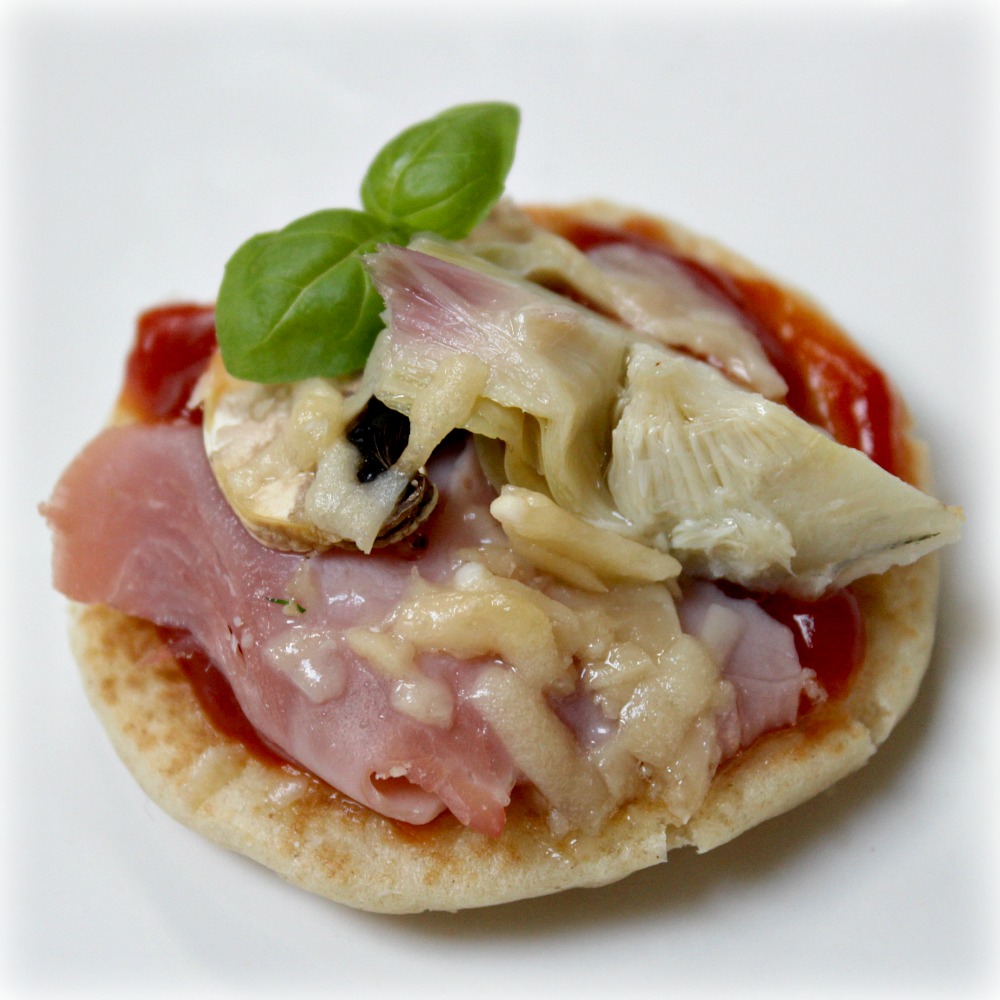 Bliny, rajčatová omáčka na pizzu a těstoviny nebo kečup, šunka, žampion, parmezán, nakládaný artyčok, bazalka.