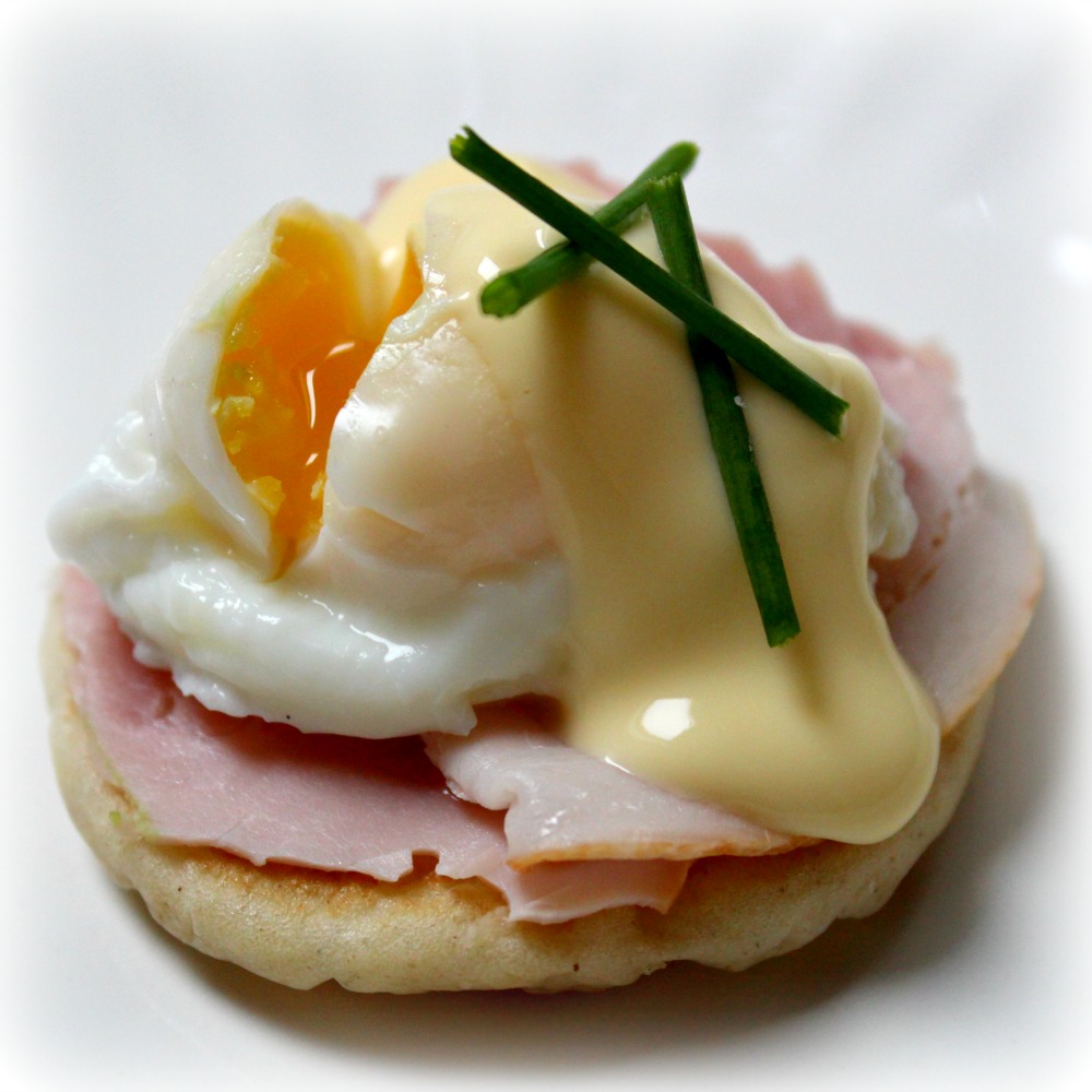 Bliny, šunka (prosciutto cotto), křepelčí vejce, holandská omáčka, pažitka.