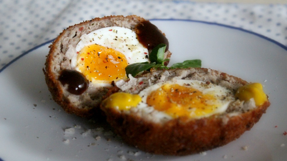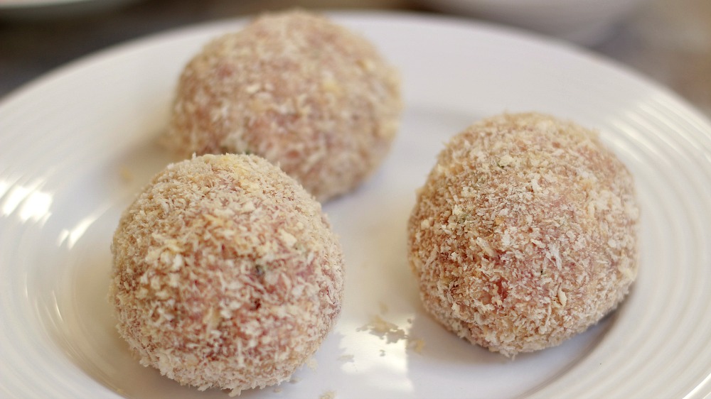 A vracíme se k receptu. Jestliže jste z Prahy, zajděte pro snídaňovou klobásku buď do Náplavní 5 (u Mánesa) nebo do Petrské 23 (u Florence). Jedna má 100 g, stojí kolem 35 Kč, to vychází přesně na obalení jednoho vajca. Už je ochucená solí, pepřem, tymiánem a šalvějí, navíc má správnou konzistenci, takže maso nebudete už muset přimlít v mixéru. Všechno maso je tu z přeštických prasátek a věřte, že třeba na kotletě poznáte opravdu zásadní rozdíl, používala jsem ji třeba tady. Nebo kupte mleté (cca 270 Kč/kg) a dochuťte dalšími ingrediencemi v rozpisu a polovinu množství rozmixujte na mazlavější fáš, tím lépe ulpí na vajíčku.