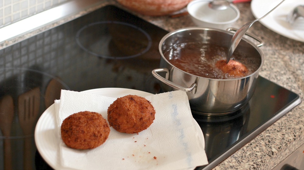 Olej by měl mít 185 – 190 °C. Ideální je mít buď friťák s nastavitelnou teplotou a kontrolkou a nebo kovový teploměr. Jinak je to trochu věštění z křišťálové koule, kdy s tím prvním už můžete/musíte začít. Během smažení si vzpomenete na radu z videa, že je dobré si vajíčka osušit, než je zavinete, jinak voda na jejich povrchu začne v oleji znatelně prskat. Každopádně trvat to bude 3 -4 minuty, občas ho obraťte, jděte podle barvy do zlatohněda. Po usmažení je nechte ještě dvě minutky odpočívat, ať dojdou, jak mají. Rozkrajovat velmi ostrým nožem, mě to šlo nejlépe se zoubkovatým na rajčata. Pak už jen posypejte krystalky soli a opepřete.