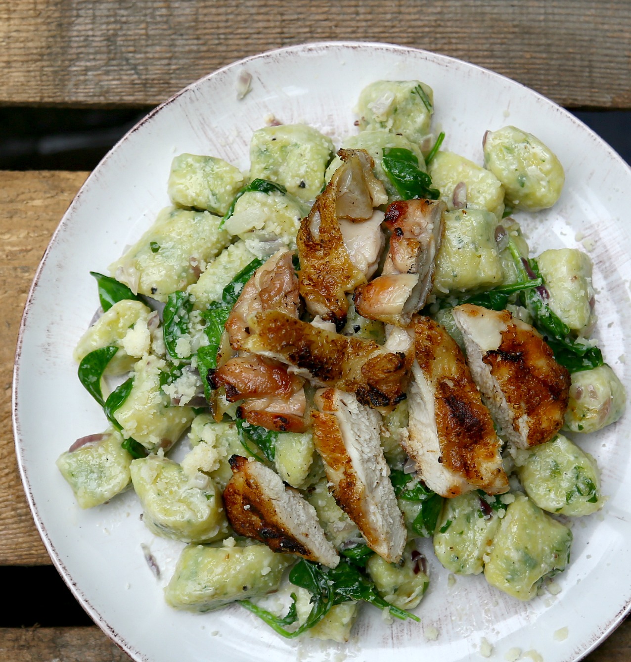 Kokoiny jemné nočky se špenátem a grilovaným jarním kuřátkem