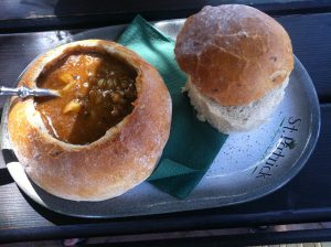 Zmocnil se mě zmar. Znovu číst ty pindoviny, cesta marná, dlouhá, ve vedru. Přecházela mě chuť. Ale hecla jsem se, pyšní se podtitulem Original Irish Pub, tak jsem se vrhla na irské speciality. Měli tři, vyhrál to, jak stojí v lístku, „Shepherd’s pie – mleté masíčko s čepicí bramborové kaše zapečené v keramické misce zasněžené sýrem (delší doba přípravy)” za 155 Kč – K tomu ta gulášovka pana GLUMA 65 Kč a česnečka 45 Kč, taky „GALWAY grilované žampiónové hlavy gratinované balkánským sýrem v keramické misce, provoněné čerstvými bylinkami 95 Kč“ a pivní brambory 45 Kč (nejsou s pivem, jsou to osmažené kostičky brambor… takže asi mají být k pivu, nebo nevím proč pivní). K pití mattonka, nealko pívo a domácí melounová limonáda – o deset minut později zjištěno, že je konzistence melounové kašičky stvořené v mixéru vhozením kusu melounu i se semínky a krátkým stisknutím ON se zapíchnutým brčkem, kterým „limonáda“ ani neprotekla a nešla nasát, protože se ihned zablokovalo, jako když vhodíte hlávku zelí do hajzlíku. Takže tu jsem tam nechala mouchám. A mouchy mohly mít ten den velkou hostinu.