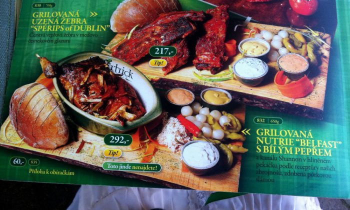 Jeden tajný tip jsem ale v nabídce měla. Bylo to něco, kvůli čemu jsem sem jela. Něco, z čeho jsem chtěla natočit další díl MENU domů. Něco, co by snad všechny zajímalo, i když jen někdo by to chtěl jíst a půlka z nich vařit doma. Ale je to v českých restauracích taková rarita, že mi to za tu cestu z Prahy stálo. Taky si to v jídelním lístku ještě označili (a právem) nápisem: „To jinde nenajdete!“ Grilovaná nutrie „BELFAST” s bílým pepřem z kanálu Shannon v hliněném pekáčku podle receptůry našich zbrojnošů, zdobená pórkovou slámou, 292 Kč, podávaná s Přílohou k obíračkám: beraní rohy, skleněné cibulky, čerstvý strouhaný křen, hořčice, grilovací a česnekový dresink a čtvrt bochníku rozpečeného teplého chleba za 60 Kč . No jo, jenže když jsem nedočkavé obsluze svůj požadavek sdělila a viděla oči v sloup, začala jsem tušit, že ta cesta byla úplně zbytečná. „Nutrii nemáme“, suše odvětila. Nevzdávala jsem se a optala, kdy bude, třeba jde jen o plonkový den, třeba mám jen totální smůlu, ale já tu jsem ještě zítra a jsem ochotna se vrátit na tu výfukovou zahrádku pro toho zpropadeného hlodavce a opravdu ho ochutnat! „Eeeee, noooo… Hmmmm…“ (celou dobu přemýšlí, jak dlouho tu můžem ještě asi tak sedět, aby nás její odpověď dostatečně od nutrie odradila) „příští týden…asi… někdy na konci, no, možná ve čtvrtek je přivezou…“ Co to sakra je? To jinde nenajdete! :-D No, tak to nenajdete ani u Patrika. Paráda. Poslala jsem ji pryč s tím, že si teda musím vybrat ještě nové hlavní jídlo. To jsem ještě nevěděla, že si ho nikdy nedám a budu odcházet z podniku od toho okamžiku zhruba za 45 minut naštvaná a jen s polévkou v břiše.