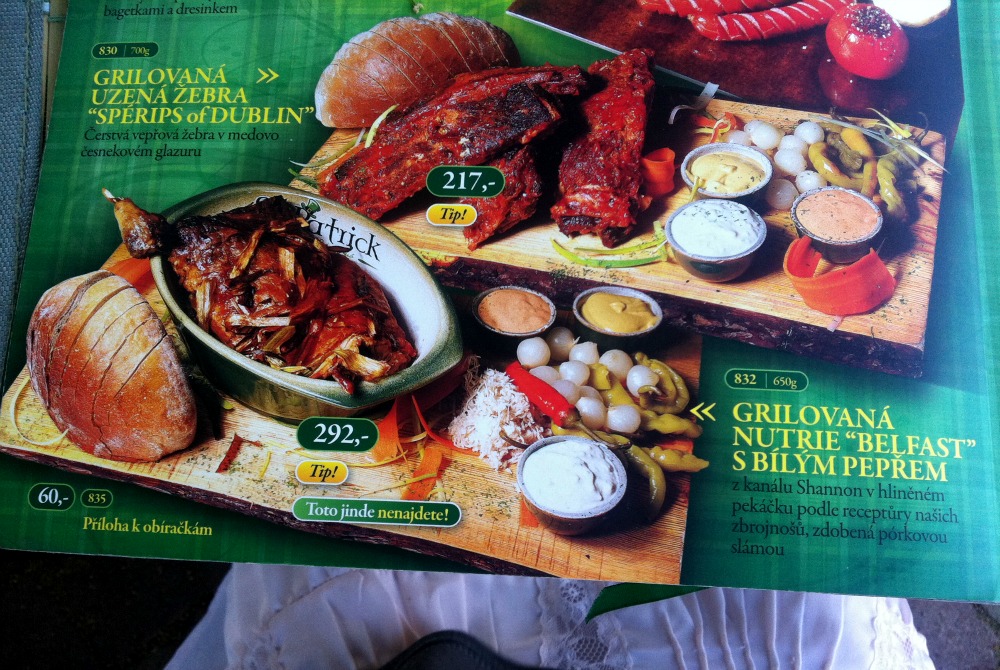 Během tohoto pro někoho dobrodružného, pro mě však otravného objevování nových a nových možností dorazila nedočkavá obsluha celkem dvakrát s dotazem, zda už konečně víme. Kdyby měli normální jídelák, tak bych sakra už dávno věděla. Ale když musím přelouskat zbytečnosti, které do menu v „lepší“ restauraci zásadně nepatří , a navíc si ukroutit hlavu a probírat se horou papírů na stole, tak to prostě trvá, la pardona. Co myslím těmi zbytečnostmi – tady se prostě nedovíte nic normálně. Já vím, že vám to v tomhle kontextu přijde určitě vtipný, ale hladový člověk se u páté stránky téhle nabídky začne klepat vztekem. Třeba hned první, co musíte přelouskat místo slov „polévky” a „gulášová v chlebu”, je v menu psáno „POLÉVKY Z RECEPTŮ HRABSTVÍ CORK” (přitom v nabídce najdete gulášovku, zelňačku, česnečku a vývar) a „Kotlík skřítka GLUMA – výborná gulášová polévka podávaná v teplém domácím křupavém chlebovém bochníku”… další příklady: „PRO NEDOČKAVOU CHÁTRU” (kdybyste to nepochopili, znamená to studené předkrmy), „KDO CHCE PROHŘÁT BŘICH, CHUŤOVKY K PIVU” (to měly být zas teplé předkrmy). Na webu mají jídelák zkrácený, ale v reálném jídelním lístku, který vám dají v restauraci, je to na každé řádce. Všechno má nějaký název, od skřítka Gluma přes Kuřecí hambáč médi „PÚ” až po všechny irské řeky, hory a města (nebo tak nějak, neobtěžovala jsem se to googlovat).