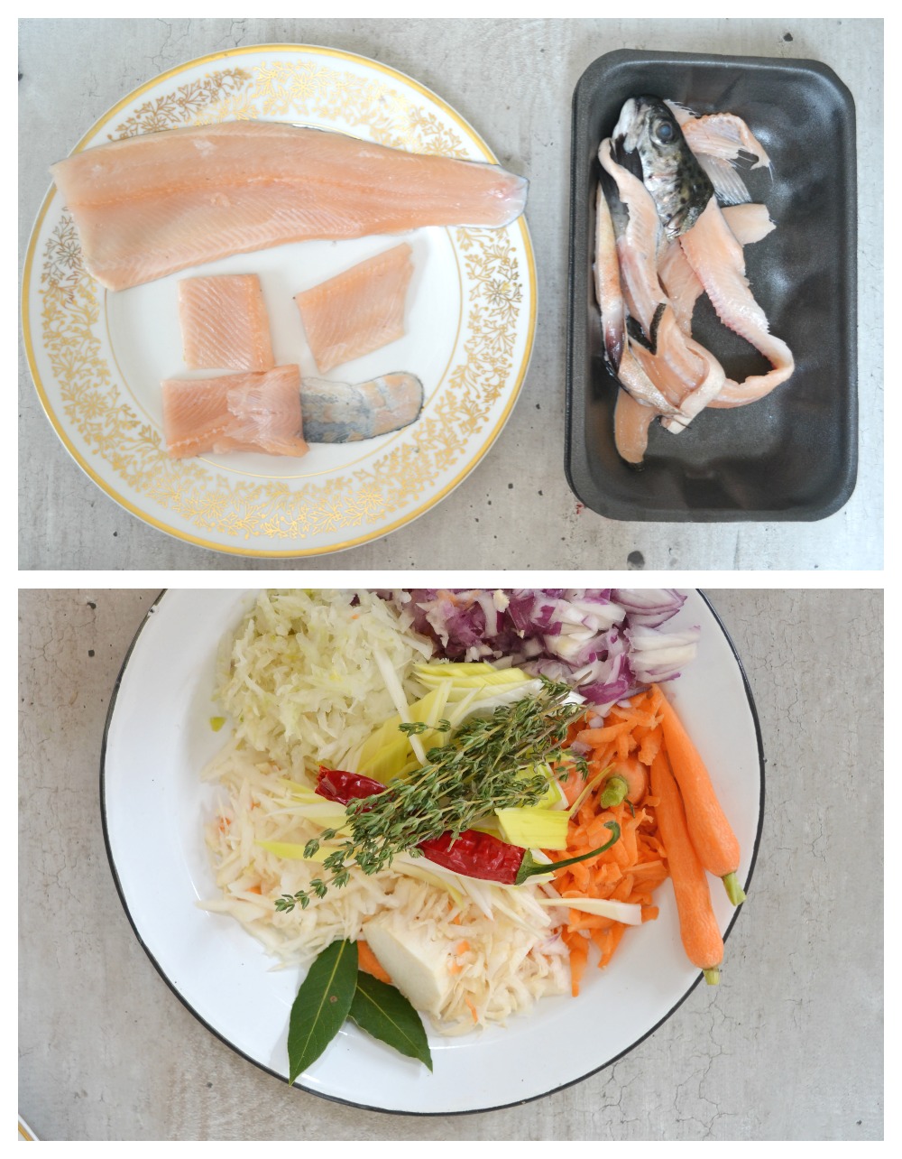 Na polévku můžete využít jakýkoli neuspokojivý úlovek, třeba nějaké karásky, malé okouny… Klidně i kapra, já mělalososového pstruha, šel by i lín, štika… Stejně tak pražma nebo mořský vlk, ale tam jsme s náklady poněkud výš. K zeleninovému základu dejte všechny odřezky z filetování (chcete-li, včetně hlavy, já nechtěla), a pokud víte, že budete i mixovat a zahušťovat, klidně i část masa. Jinak by to byla škoda, to si ho pak raději nechte do přecezené polévky. Zeleninu strouhám proto, aby dala vodě co nejvíce chuti během půlhodinového vaření. Tu, kterou máte nejradši, si nechte na následné restování, nebo ji nakonec můžete uvařit v hotové polévce. Syrové rybě stačí ve vroucí tekutině jen tak 4 minuty, takže tu přidávejte až nakonec, ať se zbytečně nerozpadá.