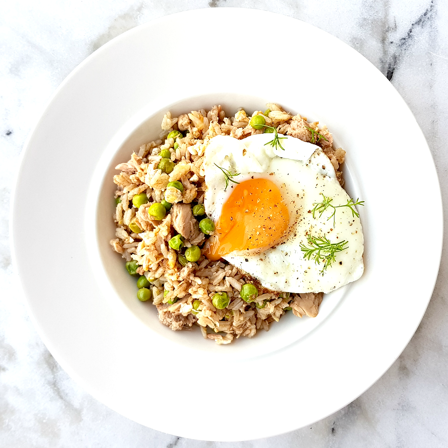 Rozehřejte pánev a vlijte do ní olej slitý z tuňáka. Rozklepněte sem dvě vejce a míchejte asi 2 minuty. Přidejte rýži, promíchejte s olejem a vejcem, ať se od sebe zrnka oddělí. Zasypejte lžičkou kořenící směsi. Smažte takhle asi 4 minuty. Pak přidejte tuňáka a hrášek, nechte pořádně ohřát. Když rozdělíte směs na dva talíře, je možné ještě udělat dvě sázená vejce (volská oka) na té samé pánvi na kapce oleje a přidat osolená a opepřená na rýži.