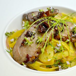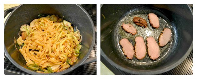 Během toho, co se maso dotahuje v troubě, uvařte těstoviny v osolené vodě podle návodu. Slijte (trochu téhle vody si ale nechte někde vedle), lehce v sítku zakápněte olivovým olejem a prohoďte, nebudou se tak lepit a ochutí se. Na pánvi rozehřejte máslo, na něm nechte restnout cibulku nadrobno dosklovata, pak i tenké plátky jablek, dokud nezměknou (2 minuty), zalijte vínem, nechte zredukovat a vytvořit šlem. Přihoďte fenykl (případně šalvěj), sůl a čerstvě umletý pepř, těstoviny a promíchejte. Pokud by se vše dělalo příliš na sucho, ještě přikápněte trochu těstovinové vody. Vedle na pánvičce už stačí jen na troše másla minutu společně prohodit maso a marmeládu (déle ne, semínka z malin by se začala opalovat a hořknout) a servírujte. Ideálním posypem jsou kvítky tymiánu, ale určitě byste se spokojili i s bazalkou.