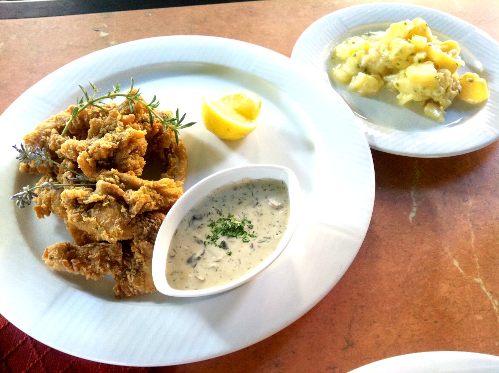 Hranolky tu pořídíte i jako polotovar, tedy kousky namarinovaného kapra, které jen obalíte v hladké mouce a usmažíte. I to mi pomohlo v bádání po co nejpodobnějším receptu na domácí obdobu slavných kapřích hranolek. Jala jsem se očenichávat nejrůznější směsi koření a vítěz se objevil velmi rychle. Maso má na povrchu pod usmaženou moukou (možná s trochou strouhanky) žlutou barvu, takže sázím na kurkumu obsaženou v kari koření. Česnek mi byl prozrazen obsluhou. Sušené zelené bylinky byly viditelné pouhým okem. Hranolky se neobalují ve vajíčku. Prostě jen namarinovat se směsí koření, kapkou bílého vína (možná místo něj používají citron, ale mně se víno líbí víc), přikápnout trochu oleje, obalit v mouce, případně směsi mouky a strouhanky a smažit. Hranolky se podávají nejčastěji s žampionovo-koprovou omáčkou z kysané smetany, nakládaných žampionů v koprovém láku. K tomu jsem si dala lehký bramborový salátek za 65 Kčladěný do vídeňského stylu – nicméně byl velmi sladký, což mi k rybě nesedlo. Doma si ho víc okyselte.