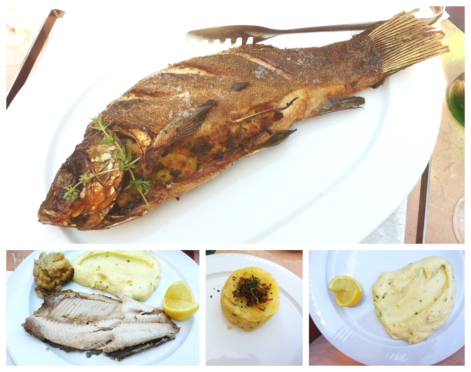 Když se řekne Třeboň a restaurace, pokud něco vydolujete z paměti, tak to budou Šupina a Šupinka. Restaurace od sebe dělí asi 5 metrů, mají vyjma denní nabídky o třech chodech shodná menu a kapří hranolky také identické. Vše se připravuje a chystá naprosto shodným způsobem, možná něco z nabídek i pospolu a jen se rozdělí do obou kuchyní. Bohužel na stejné úrovni je i um obou kuchařů, takže spíše neum. Tady vidíte pečeného lína nadívaného tymiánovou nádivkou, v jídelníčku uvedená cena je 180 Kč a 6 Kč coby příplatek za každých 10 g navíc. Proto nakonec lín vyšel na celkem 348 Kč plus přílohy – bramborové pyré za 65 Kč (! proč?) a vařené brambory 38 Kč (leč jsem dostala něco jiného, přestože na účtence je vše zadáno správně) .Na rybu se tu zbytečně spěchá co do teplotního šoku – tedy zvenku ožehnutá, pod kůží však mazlavá a uvnitř téměř nedodělaná, maso ještě tuhé. Nijak neochucené samo o sobě, pouze vycpané přesolenou základní nádivkou z rohlíků, vejce a tymiánu. Nádivka byla sama o sobě prakticky nekonzumovatelná. Rozhodně žádný požitek. Taky že na talíři zbyla. Nikdo nenabízí vykostění celé ryby – personál přes léto spíše sezonního charakteru, a tedy i jeho počínání tomu odpovídá. Místo vařeného bramboru donesli šťouchaný. Do bramborové kaše tu lijí lák z okurek nebo lák ze žampionů na omáčku, jinak si tu nakyslost prostě vysvětlit nedokážu. Na rybách mám ráda křupavou vypečenou kůžičku, tuhle smaženku byste si opravdu nedali – vše je opět způsobeno přílišným žárem působícím na rybu v krátké chvíli, místo pomalejšího pečení, kdy se podkožní tuk ztratí a maso krásně propeče doměkka. Zřejmě tu nechávají lína v peci stejně dlouho, ať má požadovaných 250 g na porci, jak se uvádí v jídelním lístku, nebo třeba i na půl kila, jako kousek, který vyšel na mě. Prostě to tam švihají jak na běžícím pásu, a podle toho to vypadá.