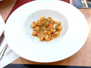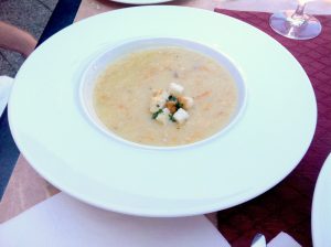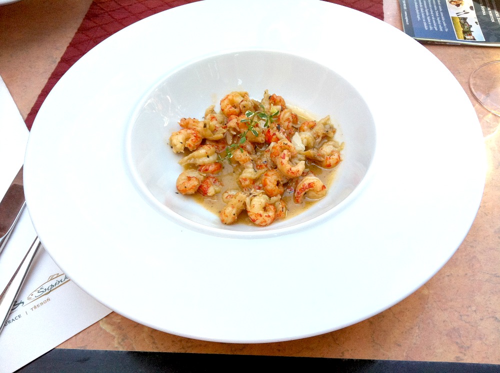 Krémová rybí polévka 48 Kč – spíše polévka z kořenové zeleniny, příliš zahuštěná, uvnitř jen jikry, ale žádný kousek rybího masa, kromě zeleniny jste necítili vlastně nic. Naopak u račího masa na bílém víně 135 Kč omáčka výrazná až příliš – tentokrát lze mluvit definitivně o přesolení. Čekala jsem více vlastní inovace – tohle byly nakládané račí ocásky z Makra v mírně slaném nálevu, přelité příliš slanou omáčkou s máslem a bylinkami. Žádný toustík s nápadem, k dispozici bylo pouze pečivo k polévce. O foodstylingu nemůže být řeč.