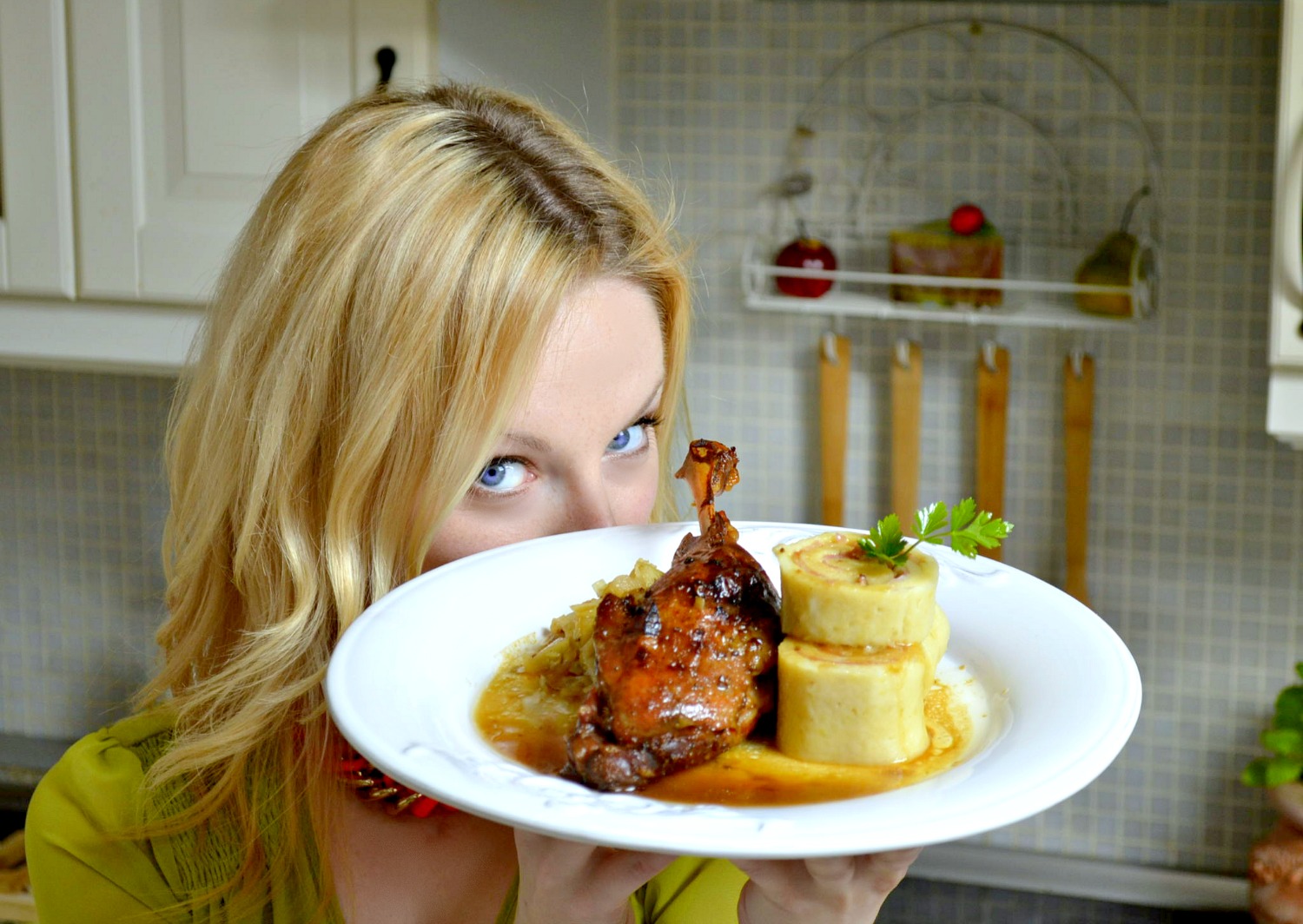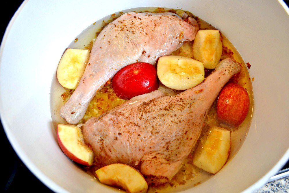 S masem začínáme, jeho pečení trvá nejdéle. Na vaření si rezervujte 2,5 hodiny. Pokud nejste ten typ, který v kuchyni jede jak fretka, ale tu a tam v klídku upije svatomartinského vína a mezi jednotlivými činnostmi si uklízí kuchyňskou linku, tak raději 3 hoďky :) Ať je vše v klidu až do konce, který je ze všeho nejdůležitější. Maso bychom měli mít z lednice vyndané minimálně 2 (ale klidně i 3-4) hodiny před tím, než půjde do trouby. Nabere pokojovou teplotu. Nejdřív si osmahneme dohněda (ale nepřipálit!) cibulku najemno. Do pekáče nebo hrnce použitelného k pečení v troubě k ní přidáme i čtvrtky jablek bez jádřinců, stehna, 2 dcl zeleninového vývaru (může být i kuřecí) a 1 dcl bílého vína. Péct musíme nejdříve zásadně přikryté, takže pekáč nebo hrnec musí mít poklici nebo horní díl. Troubu máme na 200°C na začátku, než začne tekutina v pekáčku vařit. Pak hned ztlumíme na 170°C. Každých 30 minut výpekem polijeme stehna a pečeme dál. Pokud tekutina rychle mizí, přiléváme zeleninový vývar a víno ve stejném poměru jako na začátku. Při třetím polévání (tedy po hodině a půl) pekáč rovnou vyndáme z trouby. Stehna odložíme na talíř, sundáme z kůžičky všechnu cibulku, která na nich ulpěla – pak by se připálila. Sos s cibulí a jablky přecedíme přes sítko. Zůstane jen hnědá šťáva a dost vypečeného sádla na hladině. 2/3 ho lžící opatrně odstraníme. Schovejte si ho v lednici a udělejte si na něm druhý den třeba zbylé knedlíky s vajíčkem, paráda :) Ze stěn pekáče seškrábněte vše hnědé, co na nich ulpělo. Vmíchejte do sosu. Ve skleničce v 0,5 – 1 dcl (podle toho, kolik chcete mít nakonec šťávy) rozmíchejte 1-2 nevrchovaté kávové lžičky hladké mouky a vlijte do sosu. Přelijeme zas do pekáče, přidáme stehna, ta ještě polijeme odebraným sádlem, posypeme trochou celého kmínu, vrátíme do trouby ještě přikryté, stále max. na 170 stupňů, teď budeme totiž dělat knedlíky a potřebujeme ji chvilku nemuset hlídat, ale zároveň se nesmí vysušit, takže pečeme ještě chvilku přikryté. Hned jak jsou knedlíky v hrnci, dáme na 200°C, ihned odstraníme poklici a už pečeme dozlatova. Během varu knedlíků barvu hlídáme. Když to půjde moc rychle, teplotu ztlumíme na 180°c, když moc pomalu, nic se neděje, na konci to vyřeší gril na max. Časově by to ke knedlíkům mělo vyjít akorát.