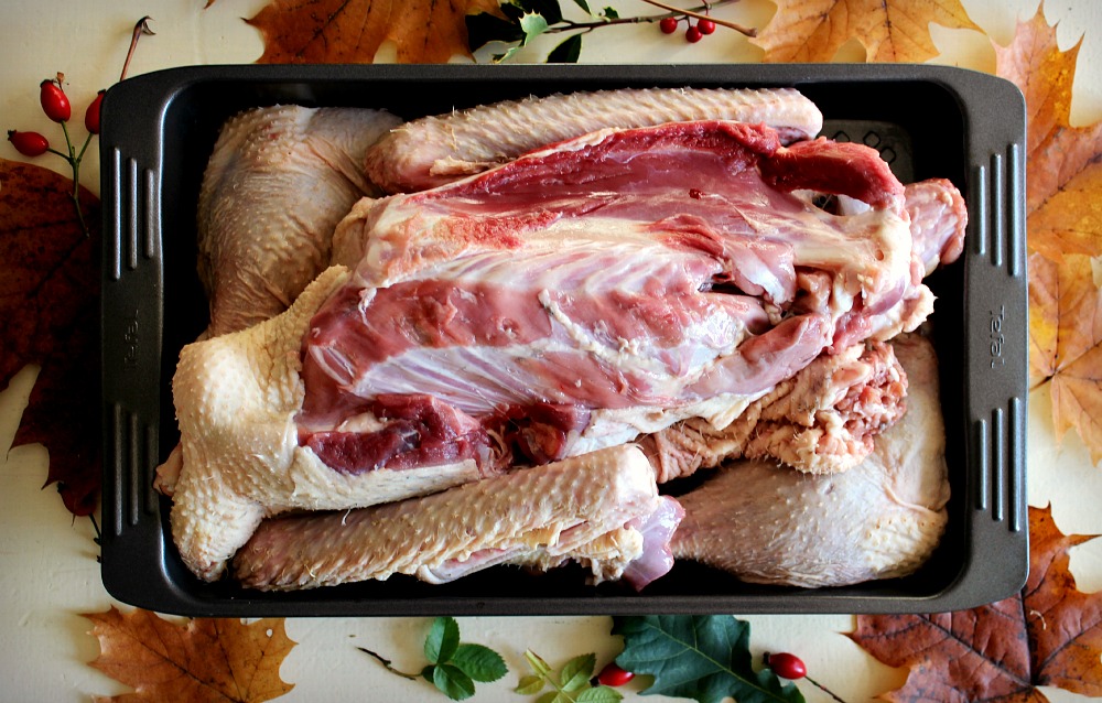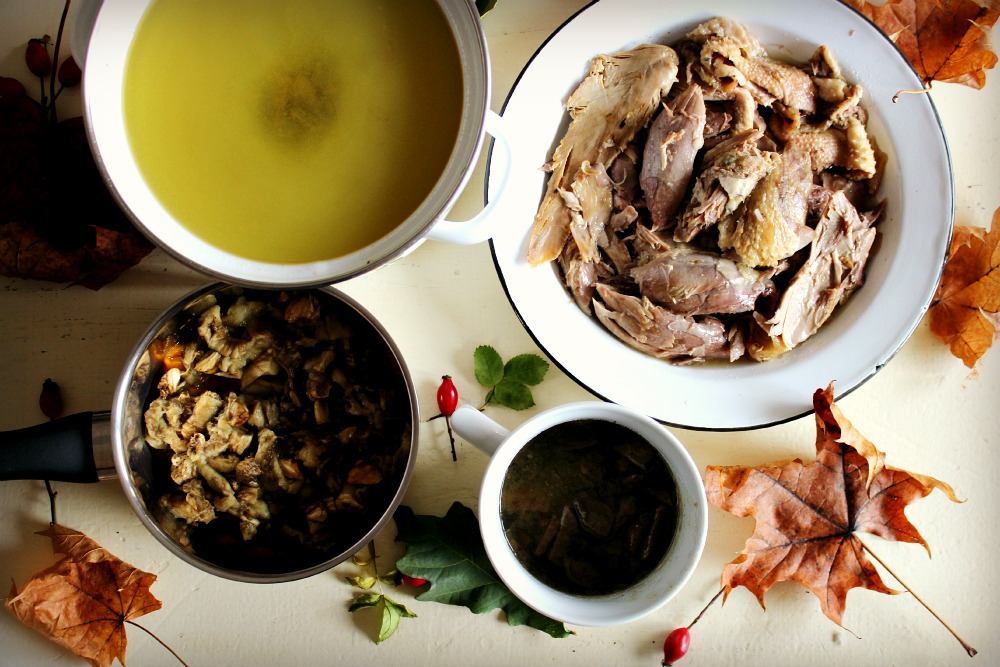 Žhavte troubu na 160 °C, to je výchozí pozice. Do pekáče nacpěte stehna, křídla, krk a skelet. Podlijte vodou do dvou centimetrového vodního sloupce, osolte to tak nějak, aby se neřeklo. Všechno potáhněte aluminiem (prostě alobalem, ale aluminium zní honosněji), vrzněte to do trouby a prostě to tam hodinku a půl nechte. Pak sejměte tu alu-věc a nechte půl hodinky bez dalšího zásahu zas péct. V tu dobu se vám už udělala parádní šťávička a na hladině plave sádélko. Křídla a krk přemístěte do velkého hrnce, pokud se vám tam podaří nacpat i alespoň část skeletu, tím lépe. Přidejte k tomu drůbky, kořenovou zeleninu a koření, které klasicky používáte na vývar. Zalijte nezbytně nutným množstvím studené vody, aby vše plovalo, přiveďte pomalu k varu a nechte táhnout klidně zase dvě hodinky. Teď jste správně pochopili, že je dobré si celou věc rozdělit do dvou dnů, při čemž ten druhý už jen sklízíte zralé plody své práce. Stehýnka v troubě dopečte pěkně dozlatova a hlavně ať jde maso krásně obrat od kostí. Vývar vaříme minimálně tak dlouho, dokud nebudou drůbky pěkně měkké. Tím máme přípravu skoro za sebou. Ještě by bylo fajn opéct prsíčko (nebo obě, podle toho, jak si to rozdělíte, o tom za chvíli) na pánvi a dotáhnout je v troubě, když už máte roztopeno. Víc o technice v receptu níž.