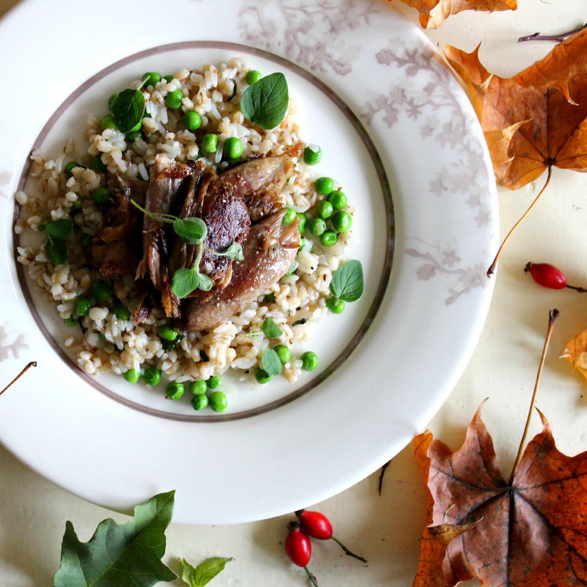 Kroupy vařte ve vodě, kde byly namočené téměř doměkka. Potrvá to asi čtvrt hodiny podle velikosti, pokud budete používat poklici, dávejte pozor, rádi utíkají. Mražený hrášek přelijte v hrníčku horkou vodou. Rýži uvařte podle návodu. Oberte maso. Z vypečeného husího sosu slijte tuk. Připravte si dvě pánve, na obě dejte asi dvě lžíce slitého sádla.