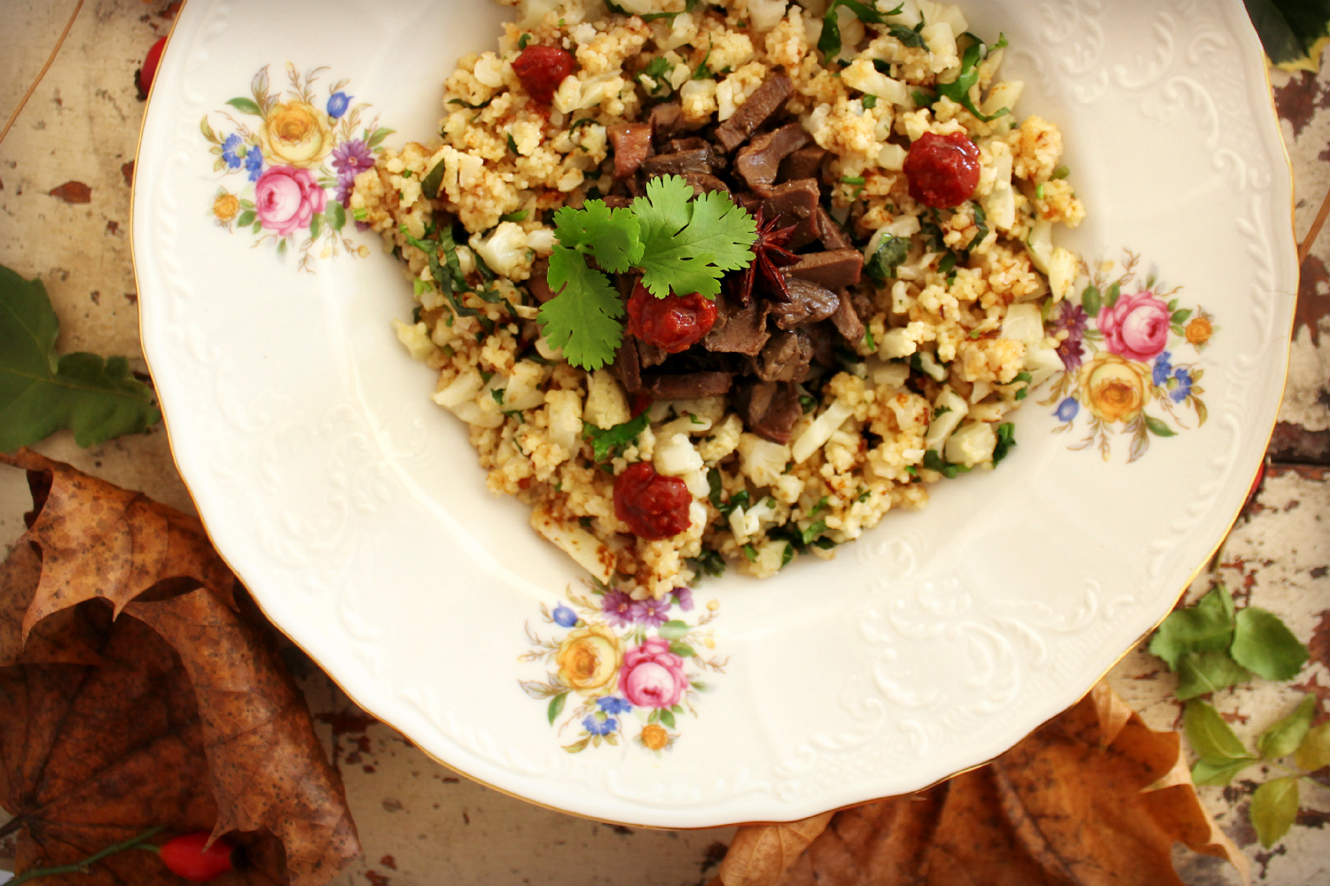 Květák pokrájejte na drobné kousky, rozmístěte ho na velkou pánev, posypejte nastrouhaným parmezánem a nažhavte to zvesela. Parmezán začne po chvilce zlátnout a květák se opeče. V tu dobu sem hoďte i už hotový kuskus a promíchejte spolu s posekaným koriandrem. Servírujte s chilli pastou dle libosti. Nevypadá to pak tak superskvěle, ale nejlepší je si všechno v talíři promíchat dohromady. Jo a ten badyán se nepapá.