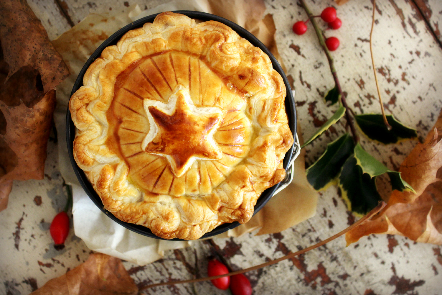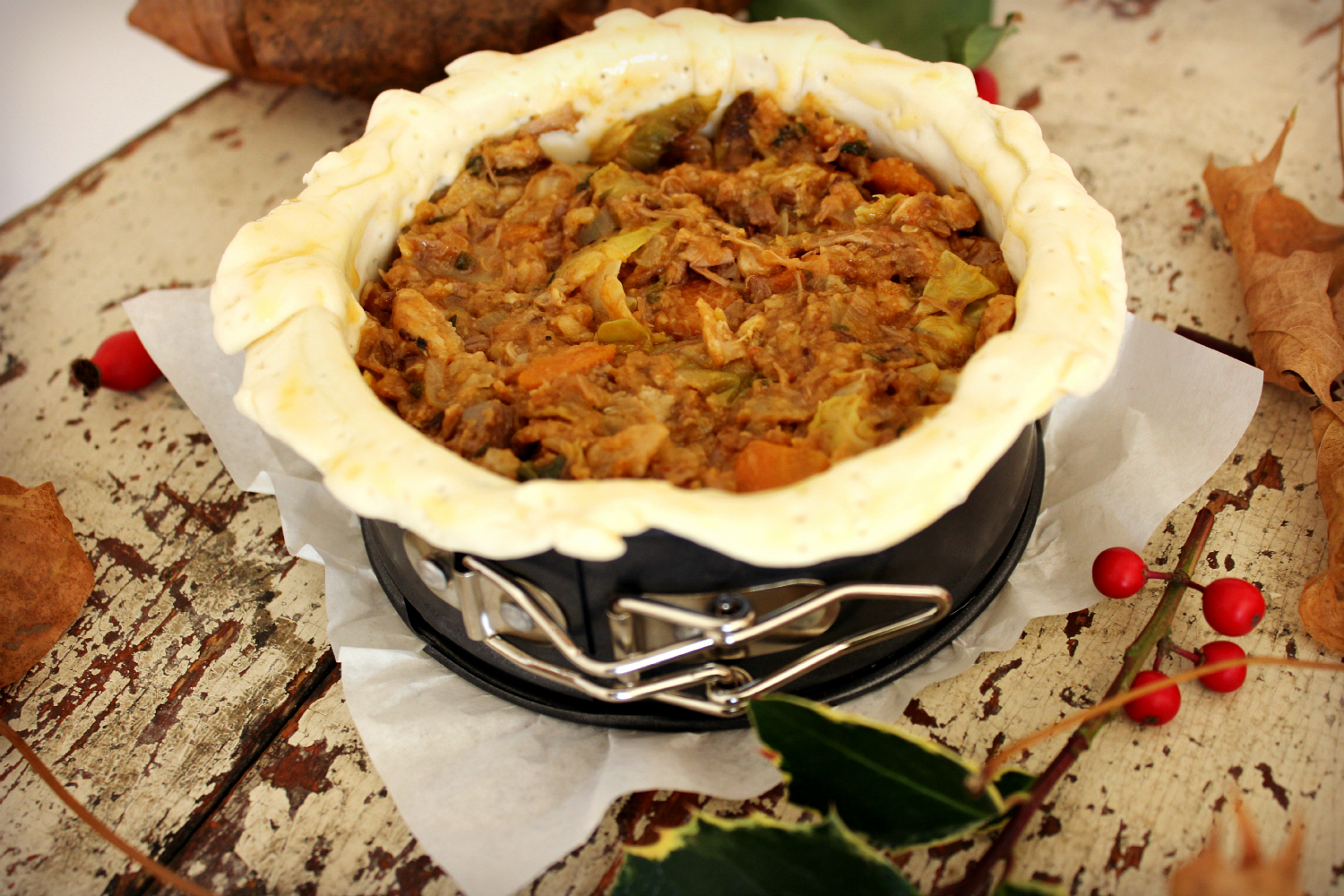 Nejčastěji rozlišujeme dva druhy pájů, co se použití těsta týče. Buďto těsto funguje jen jako poklička a nebo je jím i vystlaná celá forma. Já zvolila plán B, ale pokud to s listovým těstem nechcete přehánět, můžete dát áčko. Do páje jsem použila maso obrané ze stehen plus i kousek zbylých hotových prsíček. Asi se teď marně dopočítáváte a přemýšlíte, jaká husa má tři stehna – vtip je v tom, že já nedělala od všeho čtyři porce, jak v rozpisu uvádím, ale jen dvě. Jde totiž o to, že předpokládám, že si z receptů beztak vyberete jen něco a nebo pokud hodláte připravovat z jedné husy všechny, všichni strávníci budou tak přežraní, že půjde spíš o degustační porce, takže masa bude na všechno dostatek.
