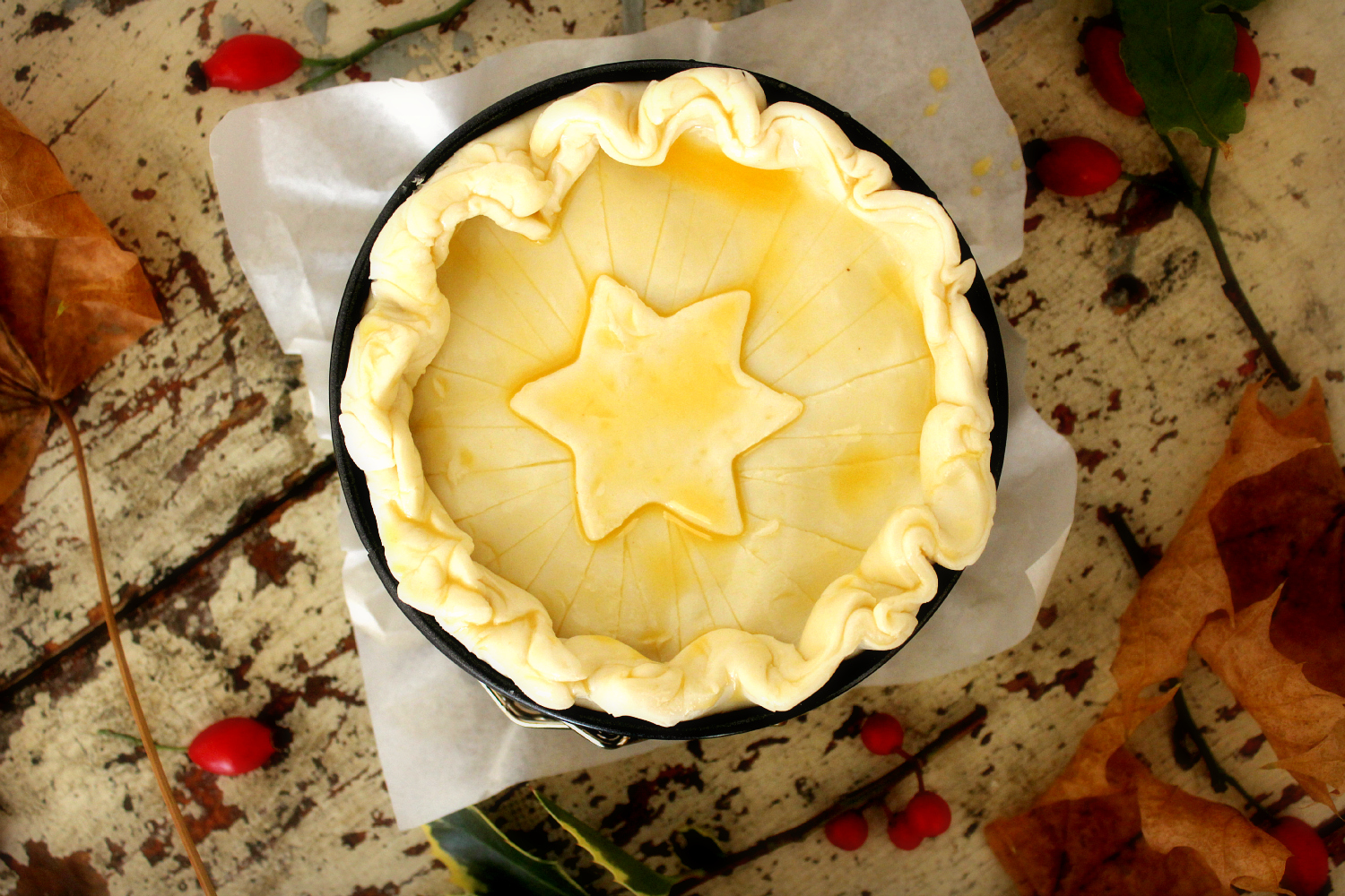 Vše přiklopte dalším těstem, můžete si i pohrát a vykrajovat jako já. Každopádně rozšlehejte vajíčko a jím potřete nejen celý viditelný povrch těsta, ale i styčné plochy těst tam, kde se má spojit a taky pod hvězdičkou, kterou chcete na těsto nalepit.