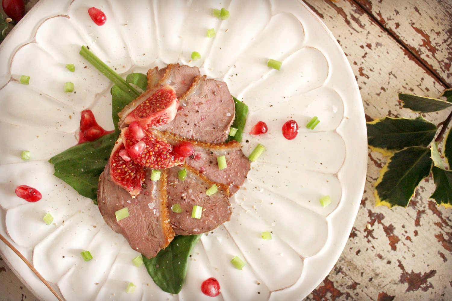 Během toho napůl rozřízněte granátové jablko, vyklepejte z něho semínka a vymačkejte šťávu. Fík nakrájejte na měsíčky a odstraňte tmavou pevnou slupku. Omyjte salát. Velmi ostrým nožem nafilírujte prso, plátky na talíři ještě lehce osolte a opepřete, polijte každou porci lžící šťávy z granátového jablka a servírujte s křupavým pečivem.