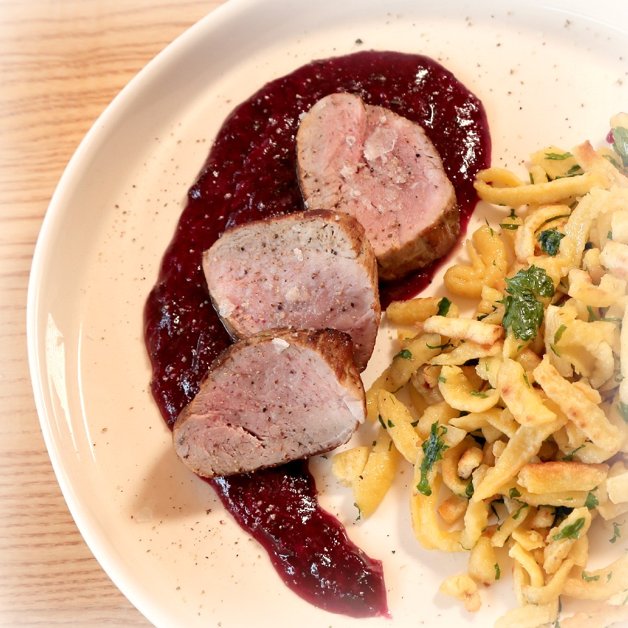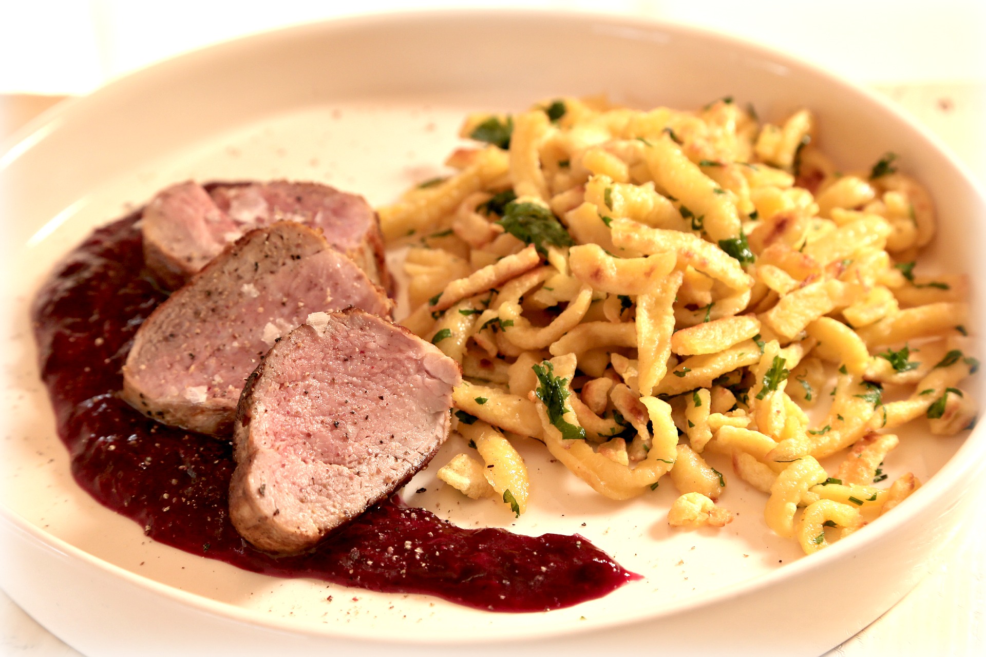 Servírujeme se spatzlemi opečenými na sádle s petrželkou nebo bramborovými placičkami (recept níž).