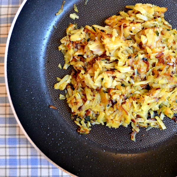 Stejně velké celé brambory se slupkou předem uvaříme, ale jen napůl, takže řekněme tak 10 minut. Necháme vychladnout, oloupeme. Nastrouháme nahrubo. Nastrouháme i cibuli. Tu na oleji necháme zezlátnout, pak přidáme brambory, osolíme a opepříme, lehce na pánvi upěchujeme a necháme také dozlatova a doměkka orestovat. Obracíme po větších kusech plochým náčiním. Nakonec přidáme ideálně čerstvou nasekanou majoránku.