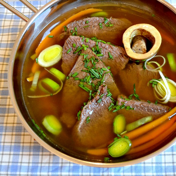 Není to u tohoto receptu běžnou praxí, nicméně mě se to tak líbí víc, takže morkové kosti nejdříve zatahuji v troubě a až pak je vkládám do vody na vývar. Stačí je jen vybalit, omýt a vložit na pekáč. V troubě jim stačí tak 10-15 minut na 170°C. Specielně pokud si hodláte morek pak namazat na topinku, je takhle chutnější. Také vám doporučuju vývar dělat z více masa, než pak k tafelu sníte. Uvařené ho můžete využít pak např. do těstovin nebo do sulcu, recept zde. Vývar musí být opravdu poctivý. Použít můžete také jen 700g masa a přidat mnohem levnějších 800g žeber, kostí nebo morkových kostí). Obecně silný vývar vznikne při použití 1 kg masa nebo masa s kostmi na 1,5 litru vody (nutno počítat s tím, že se dost tekutiny ještě odpaří, něco ztratíte procezením apod.). Morkové kosti vložíme do vody, vaříme asi 15 minut a pak přidáme maso vcelku. Orestujeme 3 mrkve, petržel a celer a přidáme do hrnce. Na troše oleje také necháme téměř zčernet napůl rozkrojenou cibuli ještě s jednou vrstvou slupky, také přidáme. Táhneme na minimum, aby vývar lehce probublával, dokud není maso tak měkké, že když ho chcete nabodnout na vidlici, vlastní nahou se začne oddělovat. Tuto zeleninu už nebudeme potřebovat, takže přecedíme, abychom měli jen vývar, kosti s morkem a maso. Ideálně přes plátno, aby byla tekutina čirá. Maso vedle nakrájíme na palec široké plátky. Ve vývaru uvaříme nakrájené zbylé mrkve. Když budou měkké ke konzumaci, přihodíme na kolečka nakrájený pórek a také plátky masa, aby se zas ohřály. Dosolíme a posypeme pažitkou. Nejdříve konzumujeme vývar se zeleninou a popřípadě s celestýnskými nudlemi. Až pak maso, brambory, špenát, jablečný křen a pažitkovou omáčku.