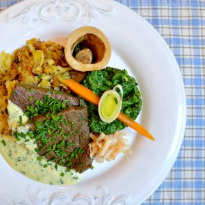 S oblibou se servíruje v měděném hrnci s kořenovou zeleninou, jablečným křenem, špenátem a brambory. Nebo dokonce v sadě kastrolů postavených na ohřívačích. Přesně tak jsem ho také obdržela v restauraci Park hotelu Popovičky – report z návštěvy najdete tady. V hlavním hrnci se skrývá silný hovězí vývar, na palec tlustý plátek šťavnaté hovězí špičky, morková kost a zelenina. V dalších najdete opékané brambůrky s cibulkou. V omáčnících se nachází jablečný křen a či vajíčková omáčka s pažitkou (oblíbená bylinka v Rakousku a Tyrolsku). Nejprve se doporučuje sníst vývar a pak teprve maso s přílohami a omáčkami. Ve skromnější domácké úpravě podáváme v hlubokých talířích maso s trochou vývaru a zeleniny, posypeme pažitkou a jako přílohu dáváme zvlášť vařené brambory a jablečný křen.