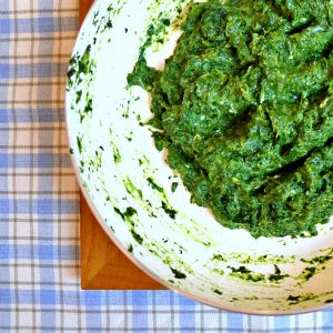 Samozřejmě můžete udělat bešamel z másla, mouky a mléka, přidat do něho čerstvý špenát a všechno rozmixovat, je-li libo. Ale protože se recept skládá už tak z mnoha úkonů, tohle si ulehčuju. Stačí jen na másle rozpustit granule mraženého špenátu a dochutit zbývajícími ingrediencemi, aby vám vyhovoval.