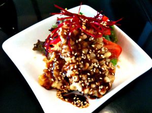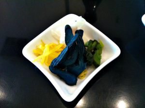 Restaurace to není levná, nicméně na kvalitních surovinách není radno šetřit, zvlášť, když člověk konzumuje syrovou rybu a nacházíme se v zemičce bez moře. Malé pivko za 71 Kč není v Praze nic zas až tak neobvyklého, couvert 90 Kč možná už je trochu „originálnější“, ale je v něm obsaženo vše od oříšků na stole (i když nepodporuji servírování v misce, do které si hráblo už 50 hostů přede mnou), přes kvašenou zeleninu, přerostlou amuse-bouche – raději napíšu neočekávaný předkrm jako pozornost podniku v podobě smaženého tuňáka se sladkou omáčkou, až po hůlky, sojovku, wasabi a zázvor k sushi.