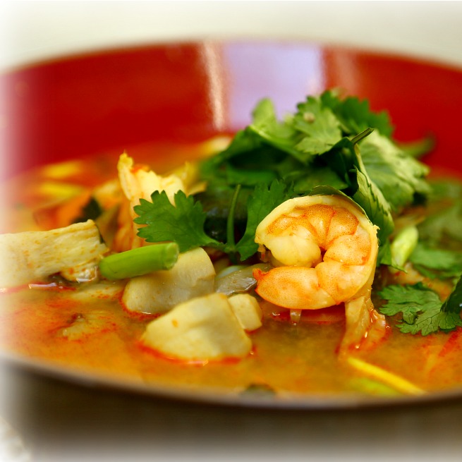 A nyní ještě k ingrediencím, které dělají z Tom Yum Tom Yum. Nepostradatelná je chilli pasta – tu svou přímo na Tom Yum jsem pořídila za 35 korun (!) v korejském obchodě kousek od pražského Palackého náměstí v Gorazdově ulici. Balení pasty vydrží asi tak na 20 porcí polévky, navíc pasta už obsahuje koriandr, citronovou trávu, galangal, můžete ji dát do litru polévky podle chuti cca 2–6 lžiček, moc nepálí. Ve stejné prodejně seženete i rybí omáčku, sušené chilli, kokosové mléko, někdy i mražené kafírové listy. Obecně vše zmíněné najdete i v Sapě v pražské Libuši – tam přikoupíte i balení asi 50 chilli papriček za 20 Kč, stejně tak obří pytel čerstvého koriandru, citronové trávy a galangal.