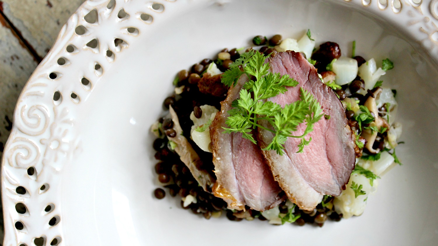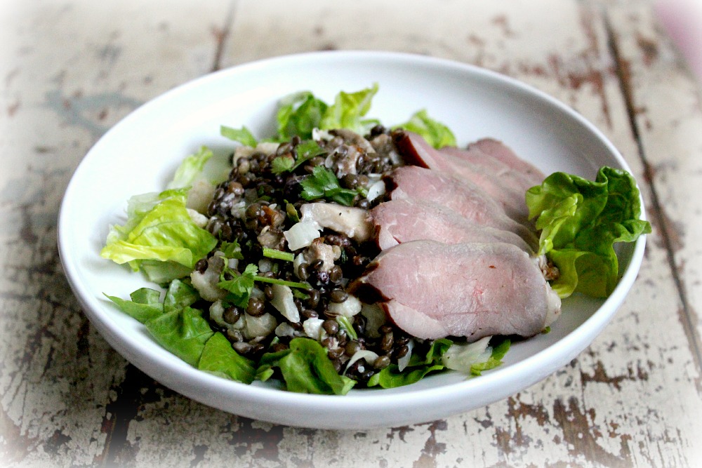 Já jsem koupila uzené kachní prsíčko. Stáhla z něho trochu přečnívající kůže s tukem. Pokrájela na malinké kostičky a nechala na sucho vypéct sádlo na pánvi. Tím se udělaly škvarečky. K nim jsem přidala shii take na plátky, orestovala, přidala asi 5 minut vařené drobné růžičky květáku a také uvařenou čočku Beluga. Spojila trochou smetany. Ochutila bylinkami (konkrétně kerblíkem a koriandrem) a přidala trochu kachního masa. Funguje to jako úžasný vlažný salát, mimochodem… :) Ale i jako superluxusní vložka do topinamburového krému.