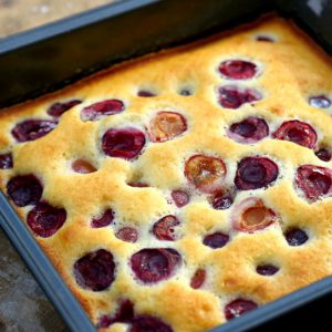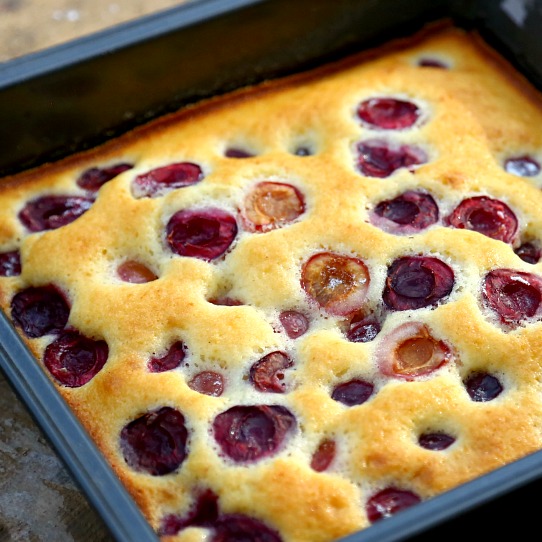 Jak jsem již několikráte zmínila a psala, jsem sladký nepečič. Někdo to miluje, v pečení se vyžívá, hňácá si těsto a pak půl hodiny zírá do trouby jako husa do flašky a kochá se, jak se to vzdouvá a nadýmá… Ne že bych do té trouby takhle nezevlila taky, ale většinou si u toho ukoušu všechny nehty, jestli se to nakonec vůbec bude dát jíst. A pro takové je tu záchrana v podobě bublaniny, kterou si můžete podle sezóny přizpůsobit a naflákat do ní, co zahrada poskytuje a hrdlo ráčí. Mně chutná snad nejvíc s jahodama a taky s rybízem. Třešně jsou ale klasika. Vzhledem ke sladkosti ovoce to chce taky vážit cukr. 100 g na tenhle poměr se mi zdá jako maximum, když beru v úvahu ještě budoucí pocukrování na talíři. Možná k supr kyselému rybízu trochu přidejte. Ale v případě sladkých jahod můžete ubrat na 80 g. A množství ovoce? Sneslo by to těch třešní i dvakrát tolik, jestli chcete. Jen je prohoďte v troše té hladké mouky, aby těsto příliš nenavlhčily.