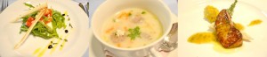Na úvod je jako studený předkrm podáván marinovaný ovčí sýr v česnekovém oleji s jarní cibulkou, rukolou a chilli. I v případě, že někdo není úplným vyznavačem kozích či ovčích sýrů, zde se není čeho bát. Sýr si zde v restauraci marinují sami a jde spíše o typ feta, který nejlépe sedne právě k lehce pikantní kombinaci česneku a chilli papričky. Následuje kachní kaldoun s játrovými knedlíčky, tedy polévka, která je mylně považována za národní jídlo Francie, avšak je klasickou českou drůbkovou polévkou. I zde je třeba podotknout, že specifickou vůni kachní drůbeže někdo možná nemusí mít rád, ale chuť této polévky si zamilujete stejně jako masitost játrových knedlíčků. Teplým předkrmem je plátek grilovaných kachní foie gras s medovou dijonskou hořčicí a meruňkovým chutney. Osobně hodnotím tuto úpravu foie gras, se kterými se v poslední době na jídelníčcích restaurací roztrhl pytel,