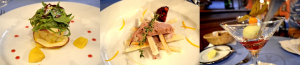 Prvním chodem je tentokrát terinka z kachních foie gras s jablky nejen sušenými, ale také vařenými v šafránu a hned na úvod je třeba uznat, že jde o nejen oku ale především jazyku lahodící souhru nadýchané teriny a ovocné chuti. Vzhledem k blížící se letní sezóně není dalším chodem polévka, ale jemná telecí paštička obalená ve slanině, s celými kuličkami nakládaného zeleného pepře a medovými tousty. Zde jde naopak o příjemný kontrast nasládlé chuti toustů a lehké pikantnosti zeleného pepře, který se šéfkuchaři podařilo dovést do dokonalosti. Navíc, brusinky skvěle podomácku udělané. Vyplatí se je ochutnat, pak už nikdy nebudete chtít ty kupované v kompotu, ale poběžíte nasbírat do lesa čerstvé. Nejen pro celkové osvěžení těla a mysli, ale hlavně chuťových buněk je určen citrónový sorbet s Campari, ve kterém vynikají malé kostičky citronové kůry a dotváří tak příjemně hořko-sladký zážitek.
