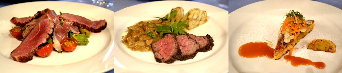 Komu už by snad pečená kachna připadala nudná, ten se zde tentokrát může těšit na modernější pojetí ve formě grilovaných a uzených plátků kachních prsíček na rukole a římském salátu s červeným zelím a cherry rajčátky. Krásně načervenalé kachní masíčko si tak můžete vychutnat na 100% a přitom jde stále pokrm v lehkém letním stylu, aby každému ještě zbylo místo na následující chod. Mimochodem, nebojte se barvy prsíček, jsou absolutně čerstvá a takto propečená absolutně delikátní. Další položkou je tzv. flank steak, neboli hovězí pupek. Servírovaný s hříbkovou omáčkou a samozřejmě domácím houskovým knedlíkem. Speciálně nakládané houby, aby jim zůstala jejich chuť a nedominoval nálev…. plus naprosto péřový domácí knedlík a křehké maso, to dostane každého. Mrkvový dort v závěru přesvědčí, že šípková omáčka není jen klasikou ke kančímu a že i zeleninu dokážou šikovné kuchařovi ruce přetvořit ve skvělý dezert. Sladká mrkvička s nádechem máty je bezvadná. Takže ano, sem Vám doporučuju jít a ochutnat hlavně zvěřinu, při nejlepším s nějakou omáčkou z lesního ovoce,