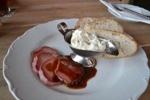 Ochutnávka se skládala ze tří položek. Jemně uzený hovězí jazyk s křenovou omáčkou a světlým chlebem, to bylo něco excelentního.