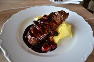 Povrch přesně akorát upečený. Bomba. K tomu byla omáčka z kaštanů s restovanou slaninkou a opékané brambůrky se slupkou. Za cenu 299 Kč skvělé.