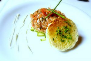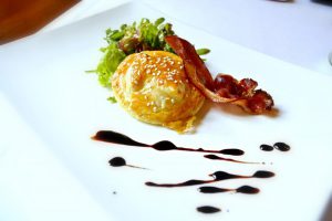 Jako první přijde na řadu tartar z lososa s limetkovou omáčkou a bylinkami na okurkovém lůžku s opečeným toastem posypaným pažitkou. Poctivá porce tataráku vás nadchne. Je nakrájený na malé kousky, nikoli rozemletý na pomazánku, takže si chuť ryby vychutnáte. Ideální spojení s kyselým citrusem je jasná volba a nastrouhaná okurka příjemně křupe a osvěží. Skvělý předkrm. Další na řadu přišel kozí sýr pečený v listovém těstě. Kdož nemusí kozí sýry, nemusí se ale chodu obávat, protože kozího mléka je v tomto případě obsaženo jen 40 procent, ostatní je kravské. Tučný sýr se nasaje při pečení do listového těsta, které je díky tomu pěkně vláčné. K tomu kysele ochucený salátek a slaninový chips. Dekorováno balsamikovou redukcí.