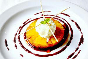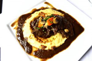 Snad vám zbyde ještě dost místa na sytá irská hovězí líčka dušená s kořenovou zeleninou spolu s bramborovo-celerovým pyré. Mě zbylo tak na půlku chodu. Líčka produšená absolutně doměkka. Silná omáčka z rozvařené kořenovky. A překvapí vás, jak moc se celer hodí k celému pokrmu a podporuje výraznost pyré. Plus místní oblíbený dezert – horký karamelizovaný ananas s nejpoctivější kokosovou zmrzlinou,