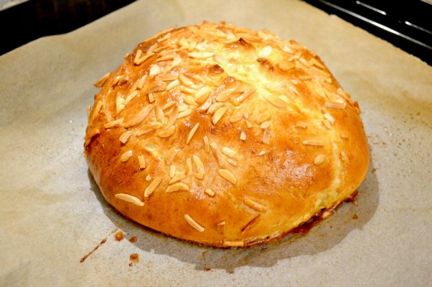 Vkládáme do trouby co nejníže (samozřejmě ne aby pekáč byl položený na její dolní stěně, ale zasuneme ho hned do nejnižšího šuplíčku). Na začátku pečeme na 200-220 °C do zezlátnutí. Chvilku je nutno do té trouby kukat jako na televizi, udělat si pohodlí, sednout si a čučet. Horní patro a mandličky potřebují neustálý dohled, abychom nevyndali z trouby místo vánočky černočku. Jak uvidíte záblesk prvního tmavého zhnědnutí, mějte u ruky kus alobalu, který jako stříšku přehodíme přes vánočku, tím zlátnutí zastavíme. Hned sundáme teplotu na 150 °C a pečeme dalších 10 minut a pak už dopékáme jen na 100°C. Špejlový test ukáže, kdy už je pečeno, abychom těsto zbytečně nevysušovali. Stačí špejli vpíchnout do středu vánočky, vytáhnout a jak na ní není nalepené žádné těsto, je hotovo. Vánočku ze dvou vajec jsem pekla asi 35-40 minut celkem, tu ze tří ve videu asi 50-60min. Záleží dost na troubě. Pokud bude třeba, aby chytla ještě trochu barvy, stačí už nechat otevřenou troubu a zapnout ji jen na gril na maximum a během 2 minut chytne potřebné barevné tóny.